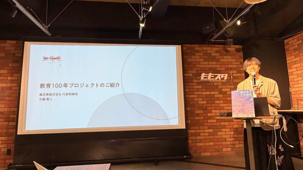続くスタートアップピッチ、無花果株式会社の中藤代表が「教育100年プロジェクト」の紹介プレゼンを初公開。