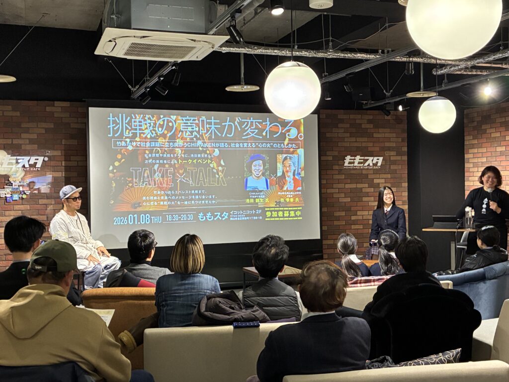 1/8(木)に『挑戦の意味が変わる。竹あかりで社会課題に立ち向かうCHIKAKENが語る、社会を変える“心の火”のともしかた。』が開催されました!今回のイベントでは、竹あかりアート集団「CHIKAKEN」代表として社会課題に立ち向かう池田親生をゲストにお迎えし、起業を志す岡山県立岡山操山中学校2年生の牧さんをモデレーターとして「挑戦とは何か?」をテーマに熱く語り合いました。