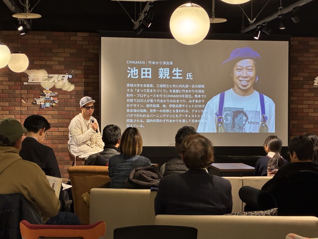 まずは、ゲストの池田親生さんが「何者なのか」というお話から。親生さんは、竹の中に灯りをともす「竹あかり」アートを通じて、イベントや風景を創り出しています。大学でまつり型まちづくりを学ぶ中で、地域に放置竹林が増えているという課題に出会い、その解決策として竹あかりの活動を始めたそう。日本で古くから日常的に使われてきた優れた素材である竹、近年は課題として扱われるようになったことに憤りを感じた、という言葉が印象的でした。親生さんは、竹あかりを通じて世界平和に貢献したいという大きなビジョンを語ってくださいました。