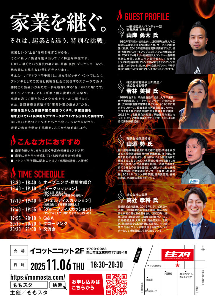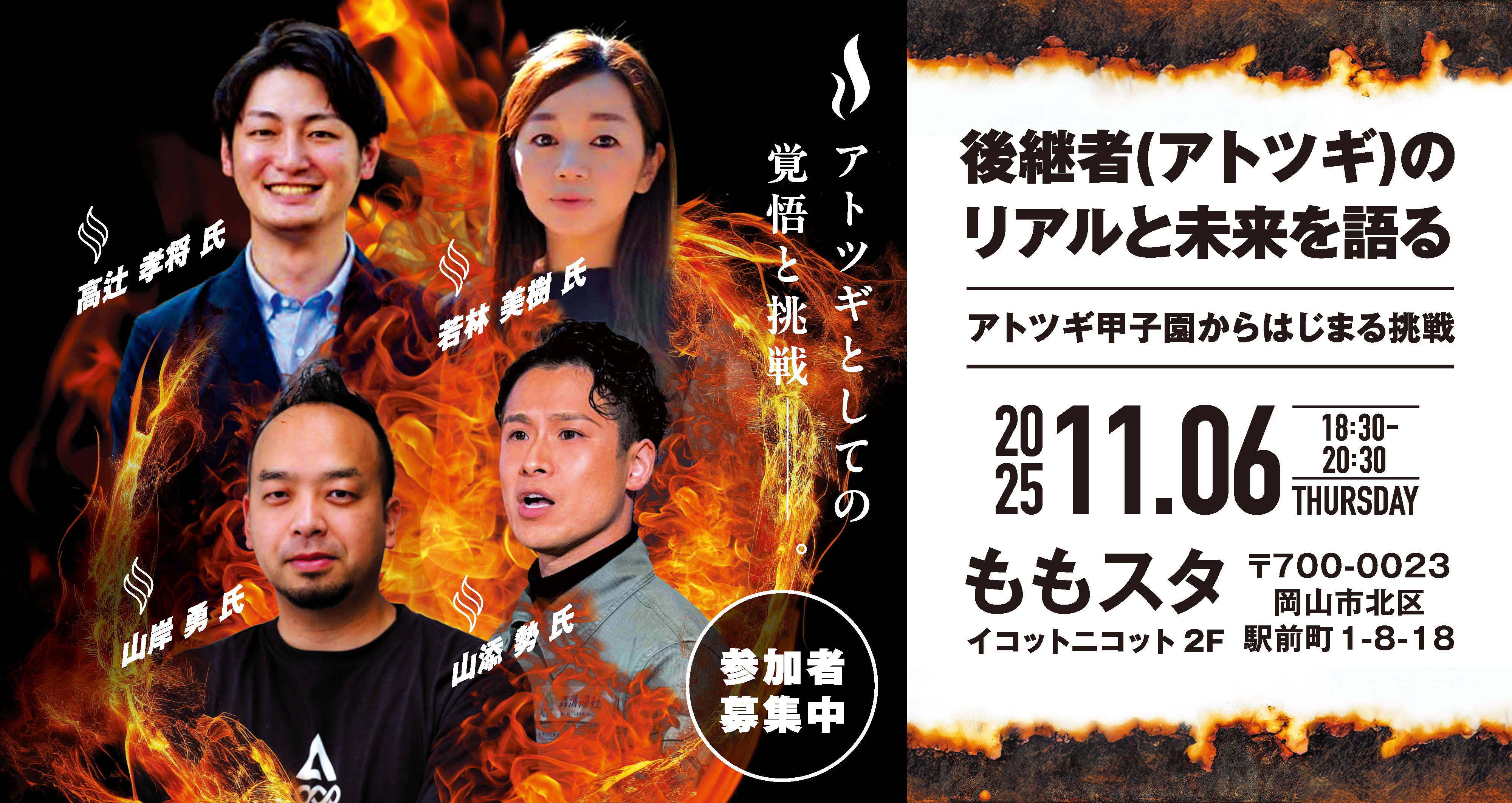 家業という“土台”を引き継ぎながらも、そこに新しい価値を創り出していく特別な存在です。しかし、継ぐという選択の裏には、葛藤・孤独・プレッシャーなど、他の誰にも見えない苦しさがあります。そんな中、「アトツギ甲子園」は、単なるピッチイベントではなく、アトツギとしての覚悟と挑戦を社会に発信するステージであり、仲間との出会いが新たな一歩を後押しする”きっかけの場”です。本イベントでは、アトツギ甲子園に挑戦した先輩が、出場を通じて得た気づきや変化をリアルに語ります。また、書類審査を突破する“事業計画の磨き方”から、家業を活かした新規事業の構想づくりや、事業計画を磨き上げていく具体的なアプローチについても伝授して頂きます。同じ想いを持つアトツギたちと出会い、つながりながら、家業の未来を動かす挑戦を、ここから始めましょう。