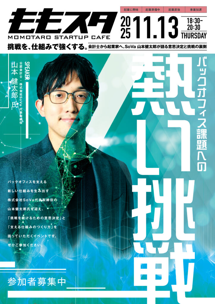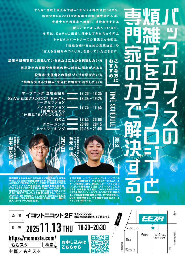 そんな“挑戦を支える仕組み”をつくる株式会社SoVa。株式会社Sovaの代表取締役山本 健太郎さんは、会計士から起業家へ転身し、挑戦者を支える新しいモデルに挑んでいます。 今回は、SoVaに出資し伴走してきたちゅうぎんキャピタルパートナーズの石元さんを迎え、「挑戦を続けるための意思決定」や「支える仕組みのつくり方」を語っていただきます。