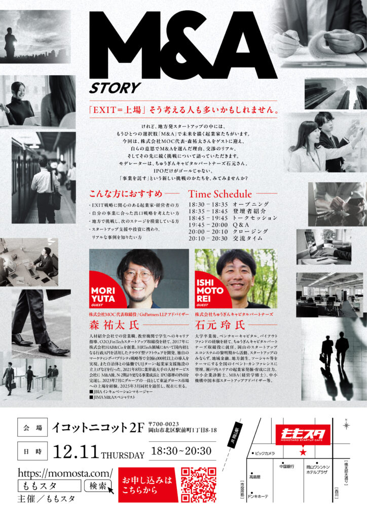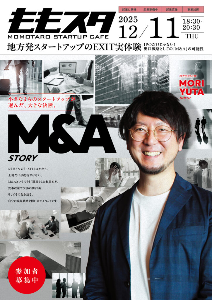 けれど、地方発スタートアップの中には、もうひとつの選択肢「M&A」で未来を描く起業家たちがいます。今回は、株式会社MOC代表・森祐太さんをゲストに迎え、自らの意思でM&Aを選んだ理由、交渉のリアル、そしてその先に続く挑戦について語っていただきます。モデレーターは、ちゅうぎんキャピタルパートナーズ石元さん。IPOだけがゴールじゃない。「事業を託す」という新しい挑戦のかたちを、みてみませんか?