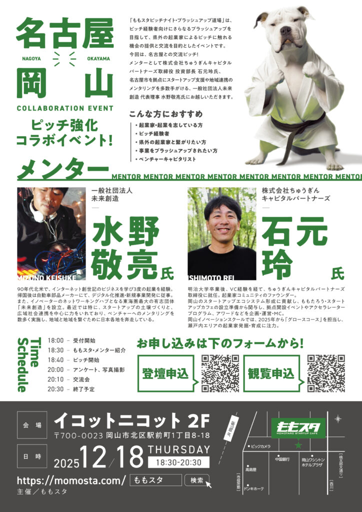 「ももスタピッチナイト・ブラッシュアップ道場」は、ピッチ経験者向けにさらなるブラッシュアップを目指して、県外の起業家によるピッチに触れる機会の提供と交流を目的としたイベントです。今回は、名古屋との交流ピッチ!メンターとして株式会社ちゅうぎんキャピタルパートナーズ取締役 投資部長 石元玲氏、名古屋市を拠点にスタートアップ支援や地域連携のメンタリングを多数手がける、一般社団法人未来創造 代表理事 水野敬亮氏にお越しいただきます。