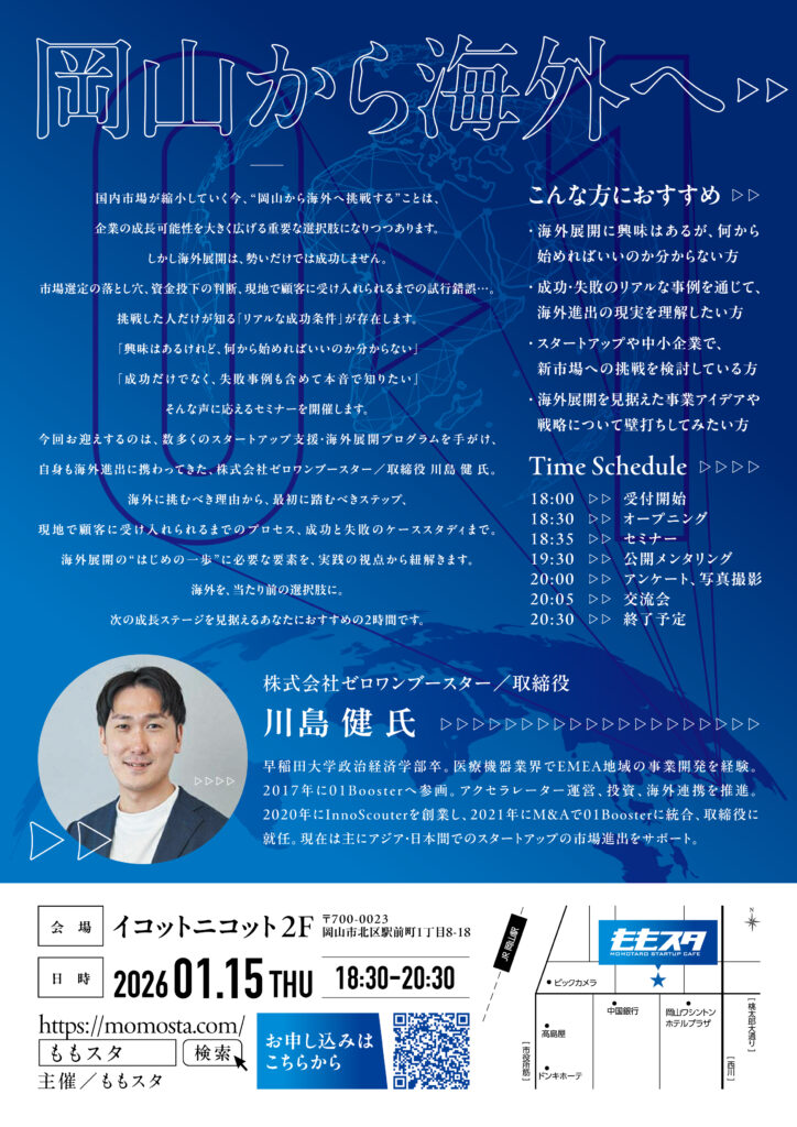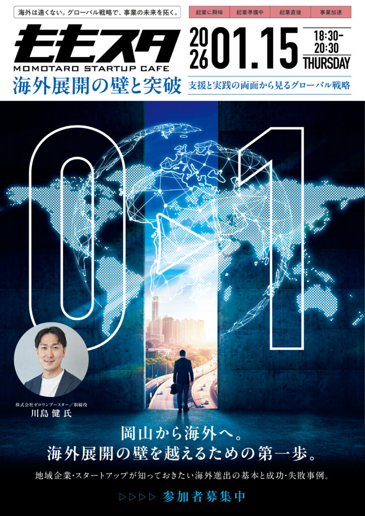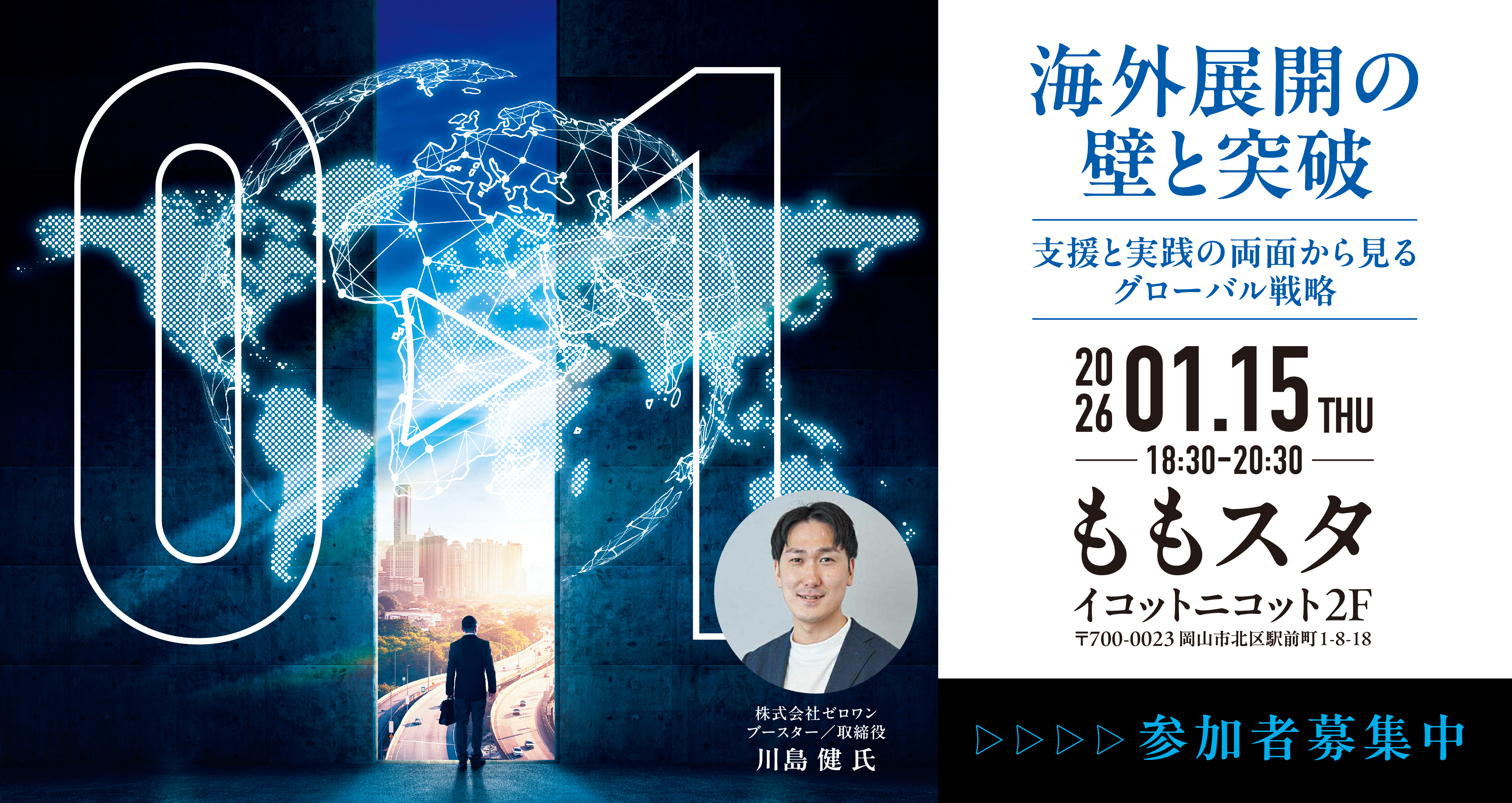国内市場が縮小していく今、“岡山から海外へ挑戦する”ことは、企業の成長可能性を大きく広げる重要な選択肢になりつつあります。しかし海外展開は、勢いだけでは成功しません。市場選定の落とし穴、資金投下の判断、現地で顧客に受け入れられるまでの試行錯誤…。挑戦した人だけが知る「リアルな成功条件」が存在します。「興味はあるけれど、何から始めればいいのか分からない」「成功だけでなく、失敗事例も含めて本音で知りたい」そんな声に応えるセミナーを開催します。今回お迎えするのは、数多くのスタートアップ支援・海外展開プログラムを手がけ、自身も海外進出に携わってきた、株式会社ゼロワンブースター/取締役 川島 健 氏。海外に挑むべき理由から、最初に踏むべきステップ、現地で顧客に受け入れられるまでのプロセス、成功と失敗のケーススタディまで。海外展開の“はじめの一歩”に必要な要素を、実践の視点から紐解きます。海外を、当たり前の選択肢に。次の成長ステージを見据えるあなたにおすすめの2時間です。