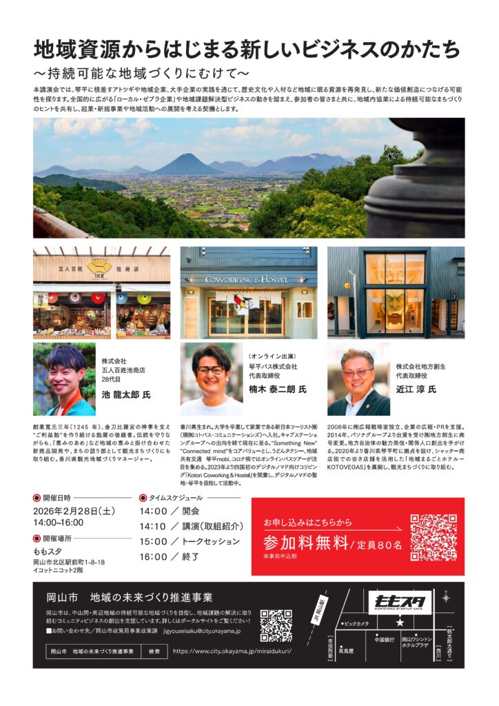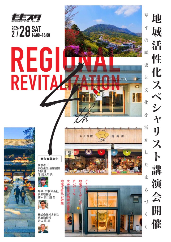 本講演会では、琴平に根差すアトツギや地域企業、大手企業の実践を通じて、歴史文化や人材など地域に眠る資源を再発見し、新たな価値創造につなげる可能性を探ります。全国的に広がる「ローカル・ゼブラ企業」や地域課題解決型ビジネスの動きを踏まえ、参加者の皆さまと共に、地域内協業による持続可能なまちづくりのヒントを共有し、起業・新規事業や地域活動への展開を考える契機とします。