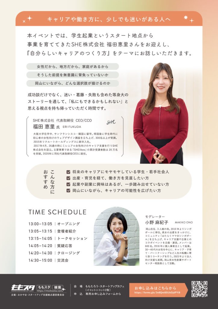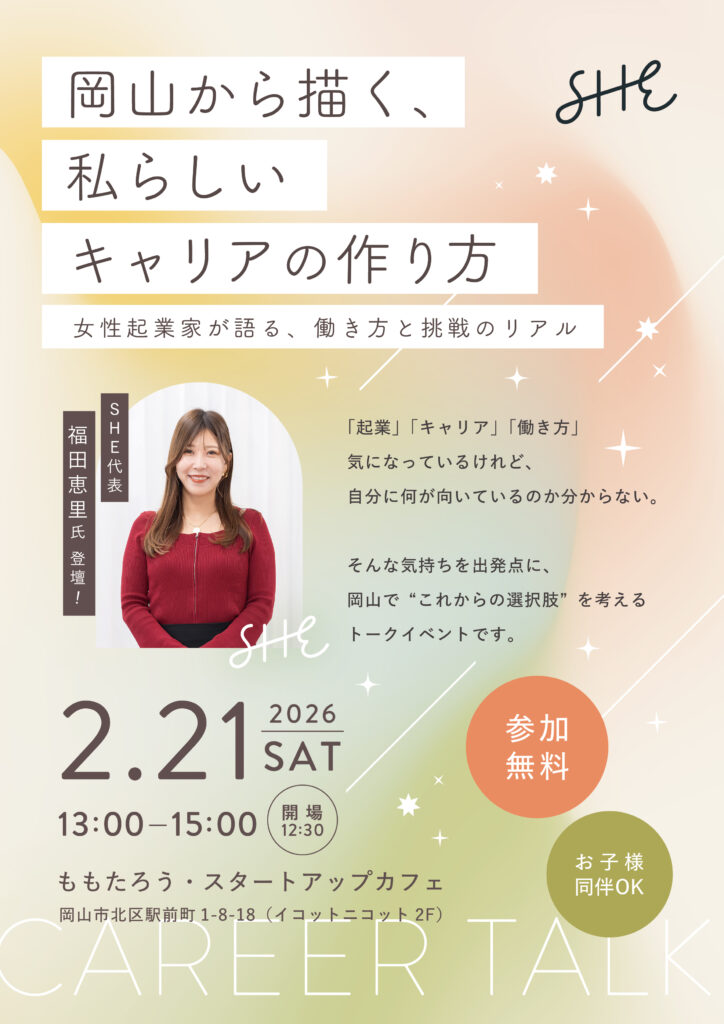 「起業」「キャリア」「働き方」気になってはいるけれど、自分に向いているのかは分からない。そんな風に感じたことはありませんか?本イベントでは、学生起業というスタート地点から事業を育ててきたSHE株式会社 福田恵里さんをお迎えし、『自分らしいキャリアのつくり方』をテーマにお話しいただきます。「女性だから、地方だから、家庭があるから」「そうした前提を無意識に背負っていないか」「岡山にいながら、どんな選択肢が描けるのか」成功談だけでなく、迷い・葛藤・失敗も含めた等身大のストーリーを通して、「私にもできるかもしれない」と思える視点を持ち帰っていただく時間です。起業に限らず、副業、フリーランス、リモートワークなど、働き方の選択肢を広げたい方にもおすすめです!