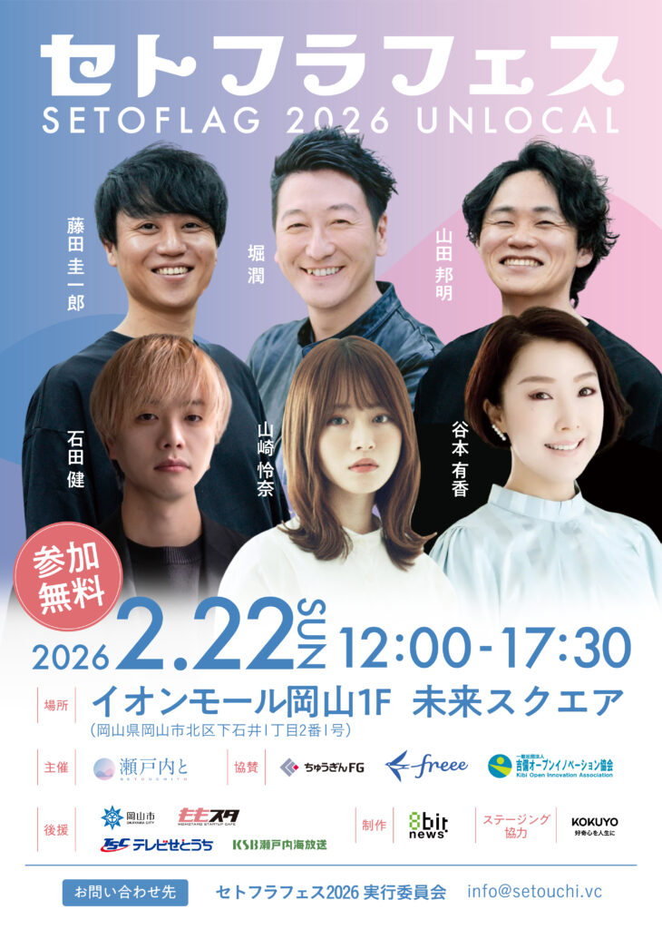 2026年2月22日(日)にイオンモール岡山 1階 未来スクエア(岡山市北区)にて「セトフラフェス 2026 UNLOCAL」を開催します!「セトフラフェス 2026 UNLOCAL」は、瀬戸内エリアを中心に、起業・教育・キャリア・創作といったテーマを軸に、多様な実践者が集い、トークセッションを通じて知見や経験を共有するイベントです。当日は、複数の登壇者によるセッションを予定しており、中高大学生、保護者、起業や地域活動に関心のある方など、幅広い方にご参加いただける内容となっています。